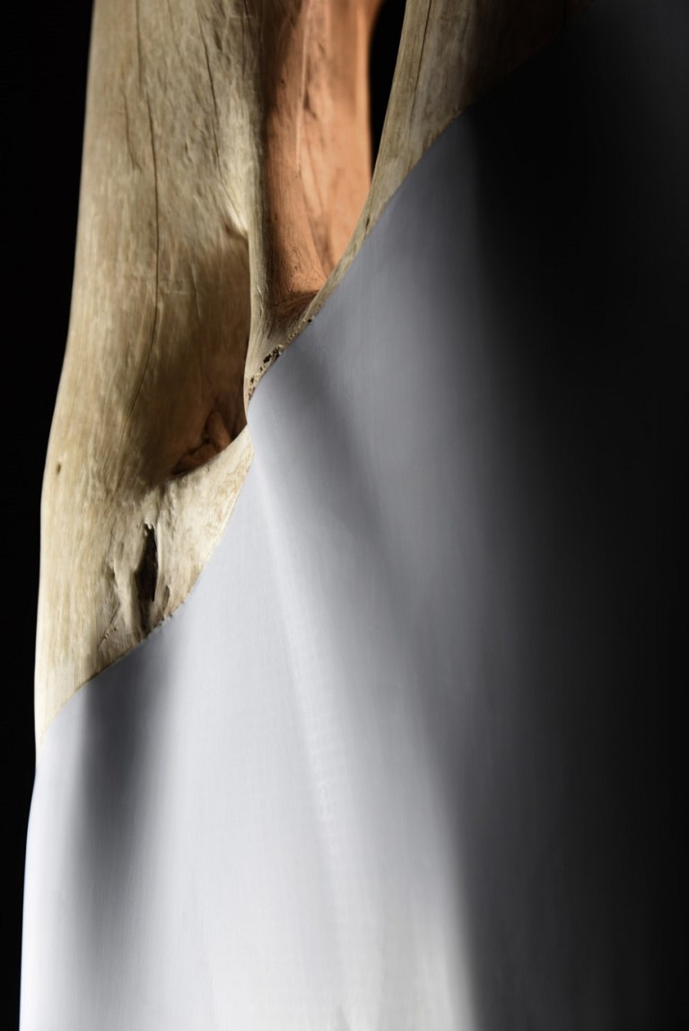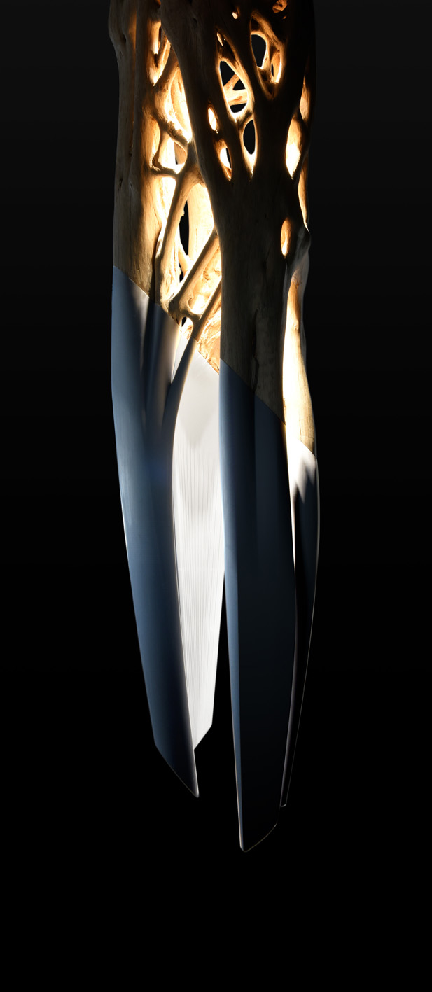 Bajando elegantemente del techo, las puntas de 3 metros de la araña del Peugeot Design Lab casi toca el suelo. Un pedazo raro y único de madera de Banyan indonesio sin uniones ni costuras se combina con la última tecnología de impresión 3D para producir este último elemento de la colección Onyx. Una técnica de contraste agudo de elementos hiper-procesados con la naturaleza más salvaje que el Lab firma como Sharp Cut y que está en la base de toda la colección.