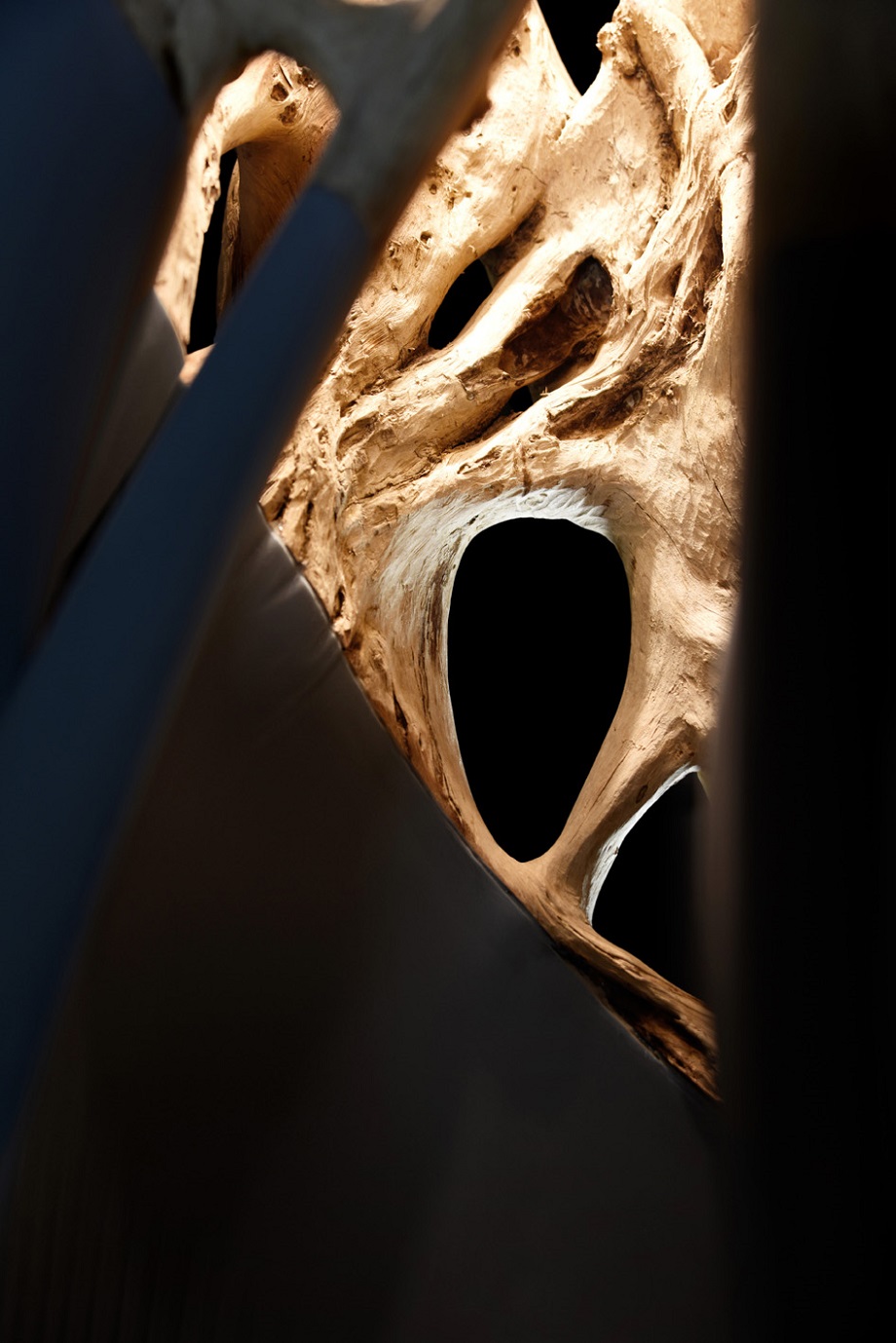 Bajando elegantemente del techo, las puntas de 3 metros de la araña del Peugeot Design Lab casi toca el suelo. Un pedazo raro y único de madera de Banyan indonesio sin uniones ni costuras se combina con la última tecnología de impresión 3D para producir este último elemento de la colección Onyx. Una técnica de contraste agudo de elementos hiper-procesados con la naturaleza más salvaje que el Lab firma como Sharp Cut y que está en la base de toda la colección.