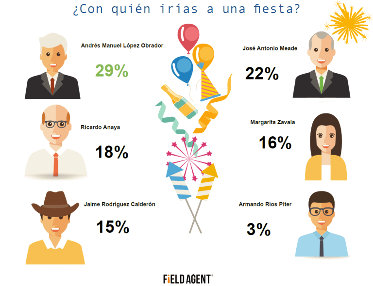 Marzo 2018 – De acuerdo con una encuesta realizada a través de FieldAgent, una aplicación móvil especializada en conocer los hábitos de consumo y tendencias del mercado en tiempo real, el 29% de los mexicanos asegura que iría a una fiesta con Andrés Manuel López Obrador, mientras que el 22% consideraría invitar a José Antonio Meade.