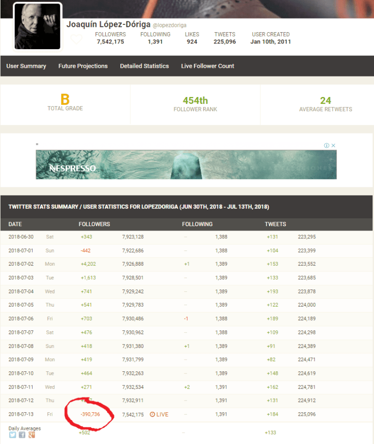 Tú también puedes ver cuántos seguidores perdió tu artista/político/enemigo etc con esta herramienta: https://socialblade.com/
