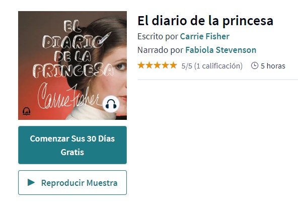 1.- Carrie Fisher: Diario de una princesa. No hay duda de que Carrie Fisher es un ícono cultural y una voz que empodera a las niñas y a la sociedad por igual. La actriz que interpretó a Leia Organa en ocho películas, narra sus memorias, desde lo que sucedió en el set de la película hasta su enamoramiento con Harrison Ford. Este audiolibro es imprescindible para aquellos que quieran conocer de una manera más profunda, a la persona que está detrás de Leia.