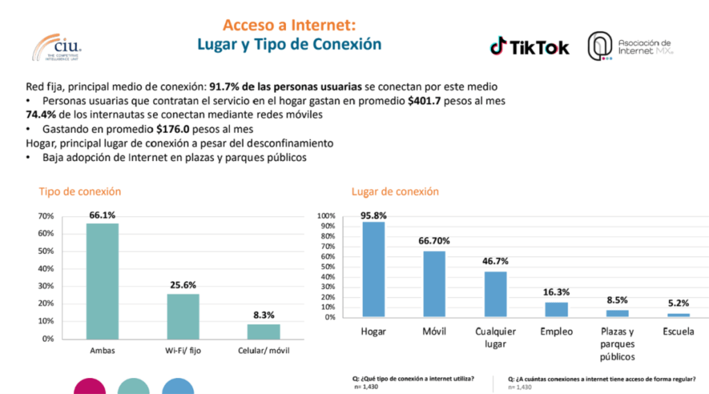 - 91.7% de las personas se conectan por una red fija (hogar o trabajo), gastan aproximadamente $401.7 pesos al mes por el servicio de Internet y un 74.4% de la gente se conecta mediante redes móviles, gastando en promedio $176 pesos.