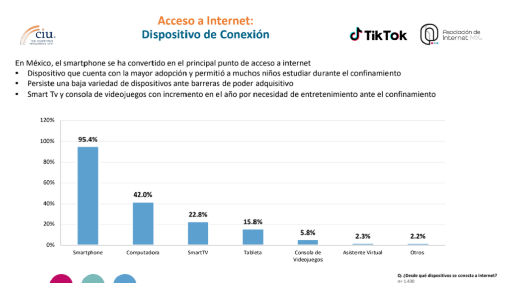 “El estudio nos permite identificar, además de la brecha de conectividad ya conocida por todos, una segunda brecha entre la gente con conectividad. 94.1% de las personas usuarias de internet correspondientes a niveles socioeconómico bajos solamente pueden conectarse a la red por medio de un smartphone, lo cual limita la realización de distintas tareas, tales como estudiar o trabajar. Lo anterior muestra una disparidad vs. niveles socioeconómicos altos los cuales tienen acceso a través de distintos dispositivos como smartphones, computadoras, smart TV y tabletas”, señaló el Vicepresidente de Investigación de AIMX, Gonzalo Rojón.