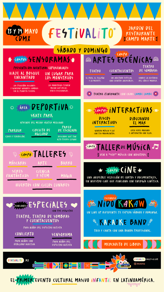 Todas las actividades de Festivalito estarán disponibles el fin de semana que dura el evento, sin embargo, el programa del escenario “Nido Kakaw” y los horarios específicos de funciones y talleres serán revelados próximamente.