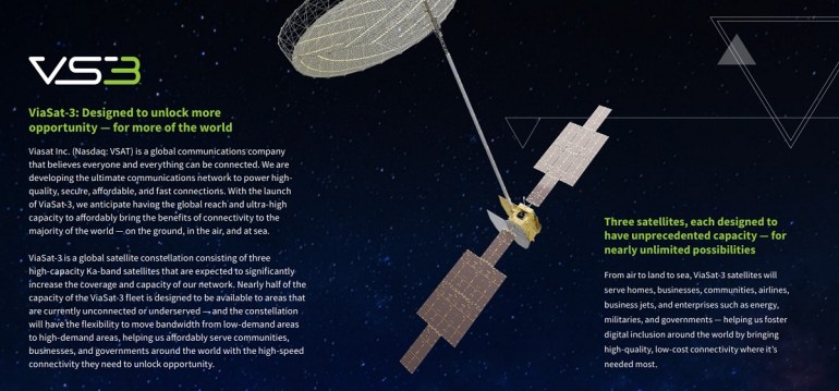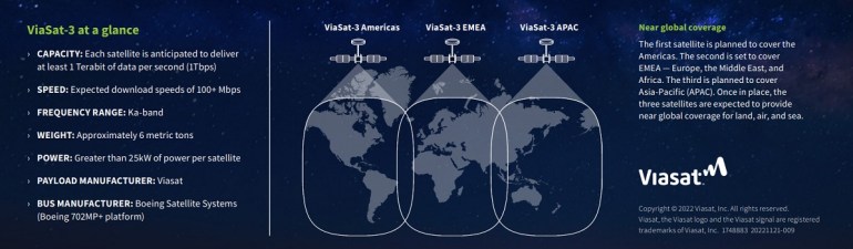 La clase ViaSat-3 de satélites de banda-Ka es capaz de entregar más de 1 Terabit por segundo (Tbps) de capacidad de rendimiento cada uno, con flexibilidad dinámica para mover y concentrar esa capacidad donde más se necesita, ya sea en tierra, en el océano o en el aire. Está previsto que los dos primeros satélites se centren en las Américas y en EMEA (Europa, Oriente medio y Asia), respectivamente, y el satélite ViaSat-3 EMEA se encuentra ahora en pruebas ambientales en la fábrica de Boeing en El Segundo, California. El tercer satélite ViaSat-3 completó la integración final de la carga útil y las pruebas en las instalaciones de Viasat en Tempe, Arizona, y se centrará en la región de Asia Pacífico, completando la cobertura de servicio global de Viasat.